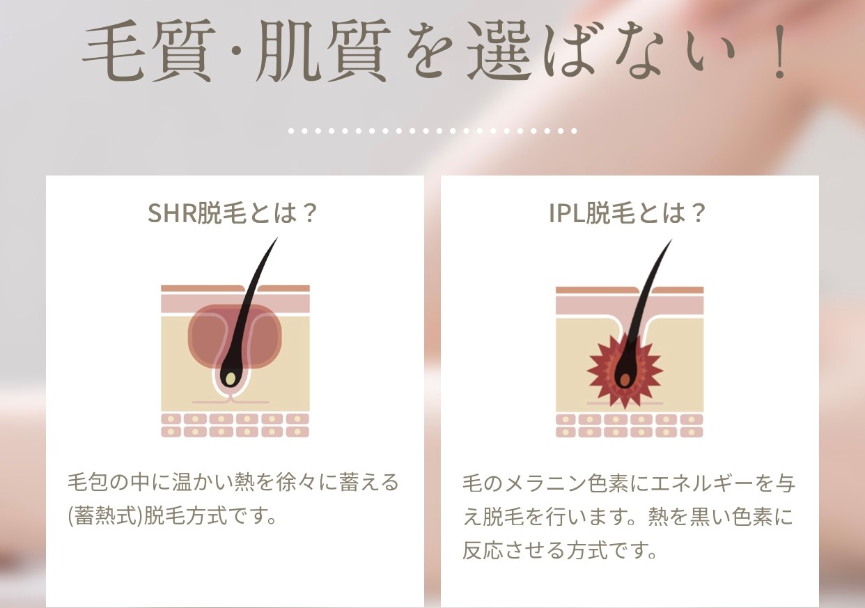 *IPL方式は毛根の黒いメラニン色素に反応し太い、濃い毛に効果があります。また 産毛や細い毛に効果があるSHR方式は 毛包をターゲットにした蓄熱式脱毛でじわじわ熱を与える脱毛方法です。肌への負担も少ないため刺激も少なくデリケートな肌にも可能です。